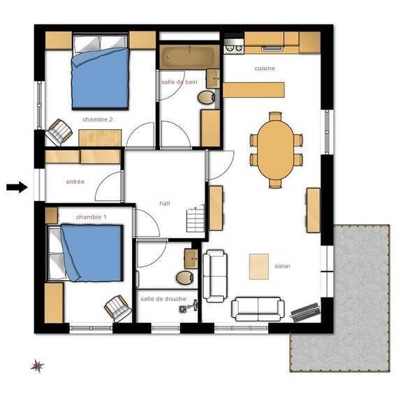 Holiday apartment located less than 5 minutes away from Le Rouge' slope and 10 minutes away from Médran's lift. Sunny place with a nice view. Living room with fire-place, 2 extra beds separated from the living by a sliding door, kitchen with dishwasher, south balcony, 2 bedrooms with 2 beds, 1 bathroom, 1 shower room. Cable TV, wifi. 1 parking place outside. No pets. No-smoking.