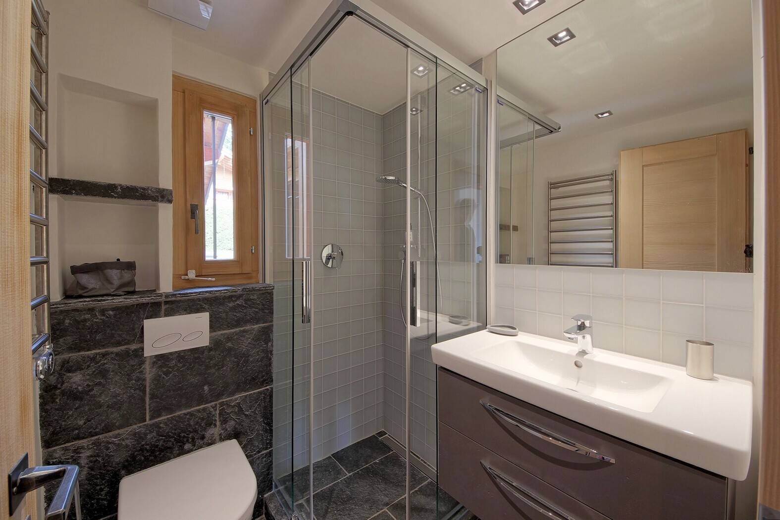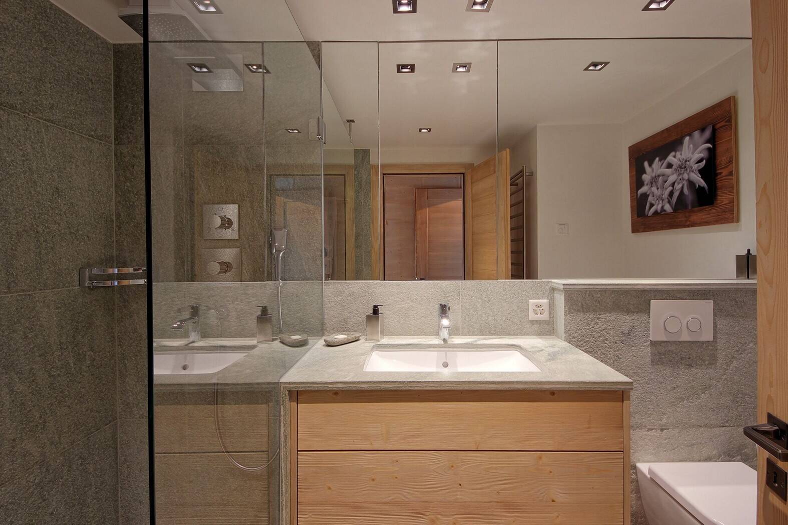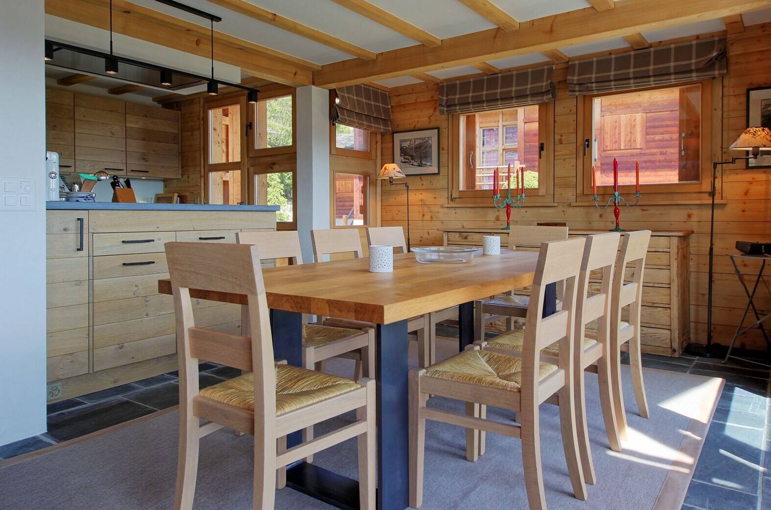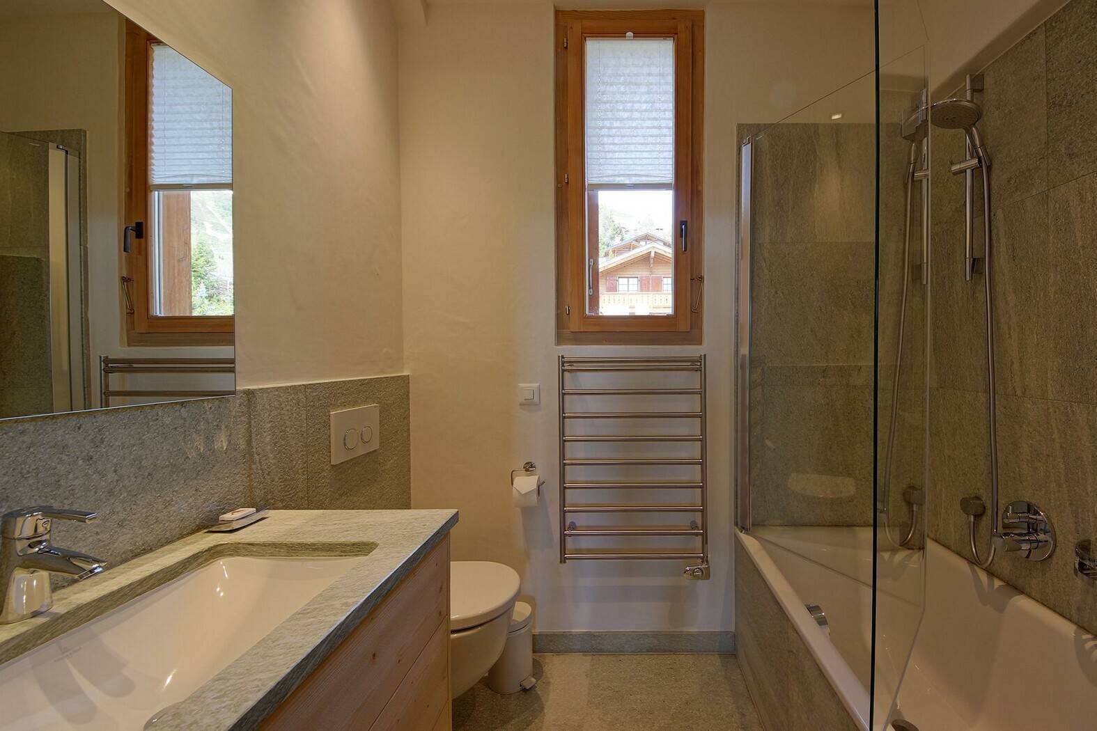 Very nice flat close to the Rouge trail, the bus stop and the Brunnet shop. Quiet, sunny and great view. Living room with fireplace and large south facing balcony, open kitchen with dishwasher and microwave, large dining area. The flat has a double bedroom with TV, ensuite bathroom and small garden to the west, a twin bedroom with ensuite shower room, two twin bedrooms, a bathroom with bath + shower and a guest toilet. Cable TV, wifi, dvd, hifi, wireless. 2 parking spaces in the garage. Smoking and animals prohibited!